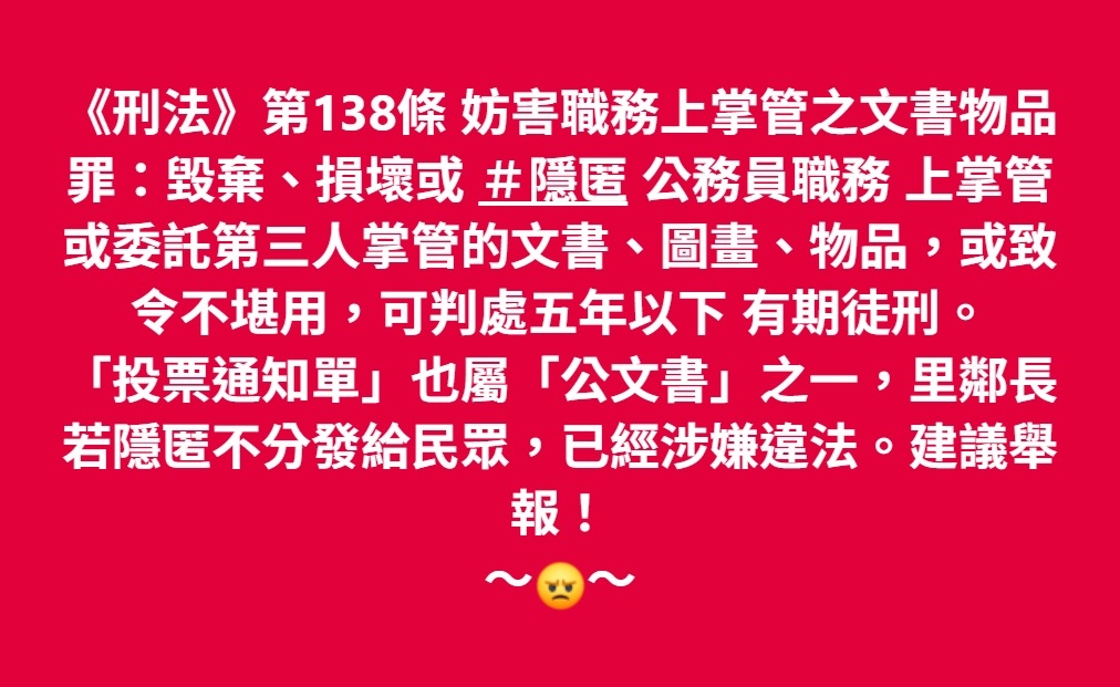 2025年7月26日 10:21 投票通知單」也屬「公文書」之一,里鄰長若隱匿不分發給民眾,已經涉嫌違法。建議舉報! ~😠~