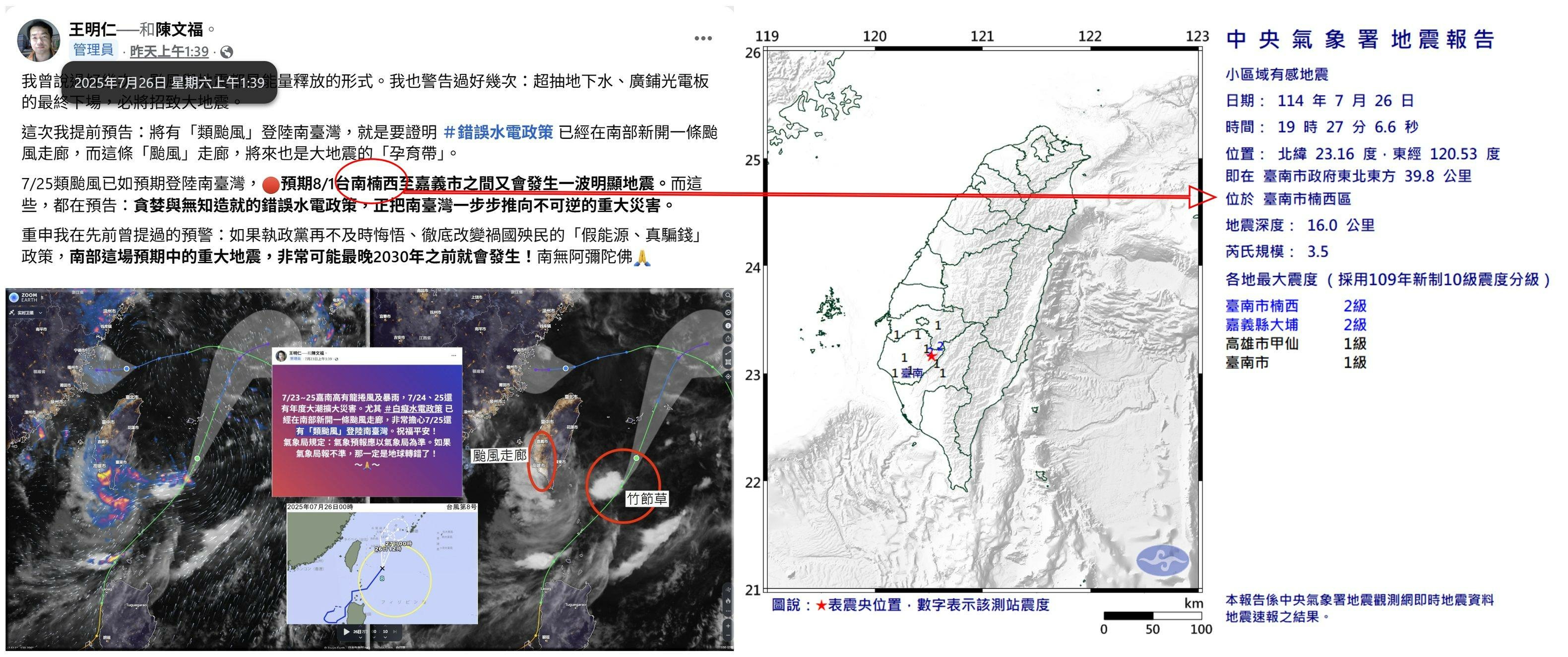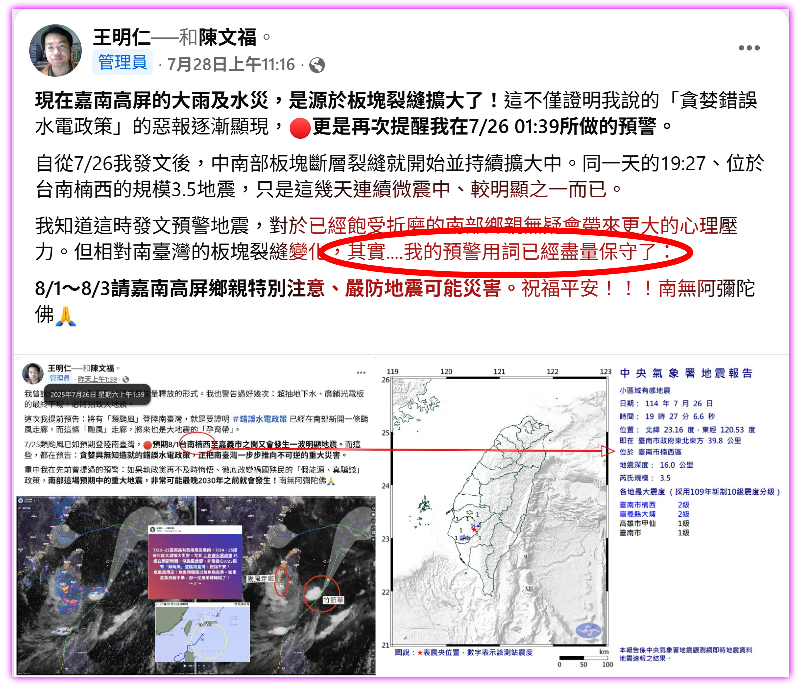 7/25類颱風已如預期登陸南臺灣,🔴預期8/1台南楠西至嘉義市之間又會發生一波明顯地震。而這些,都在預告:貪婪與無知造就的錯誤水電政策,正把南臺灣一步步推向不可逆的重大災害。