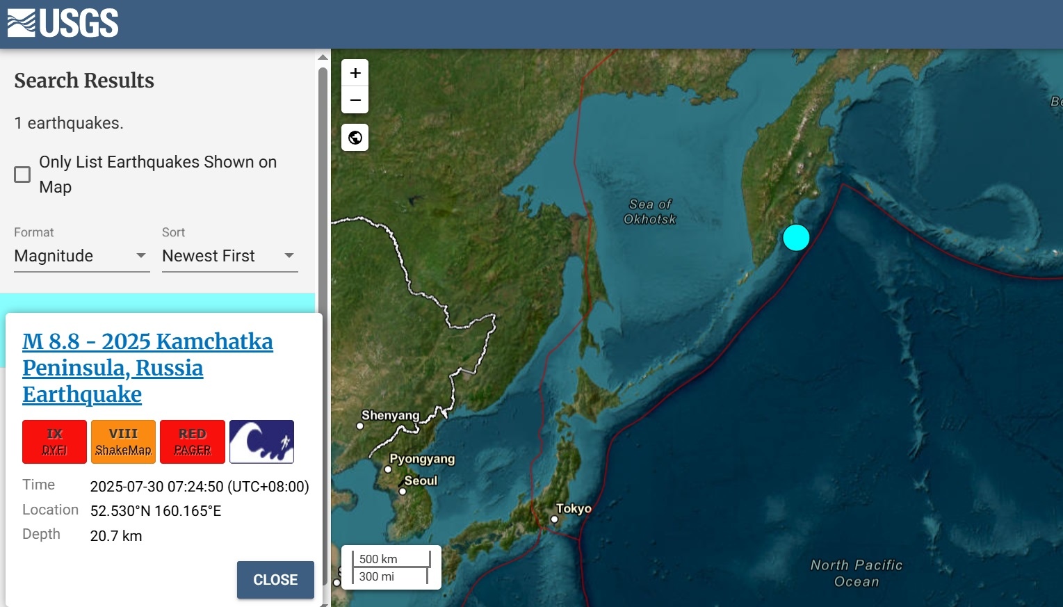 2025年7月30日 07:24 俄羅斯外海發生規模8.8大地震