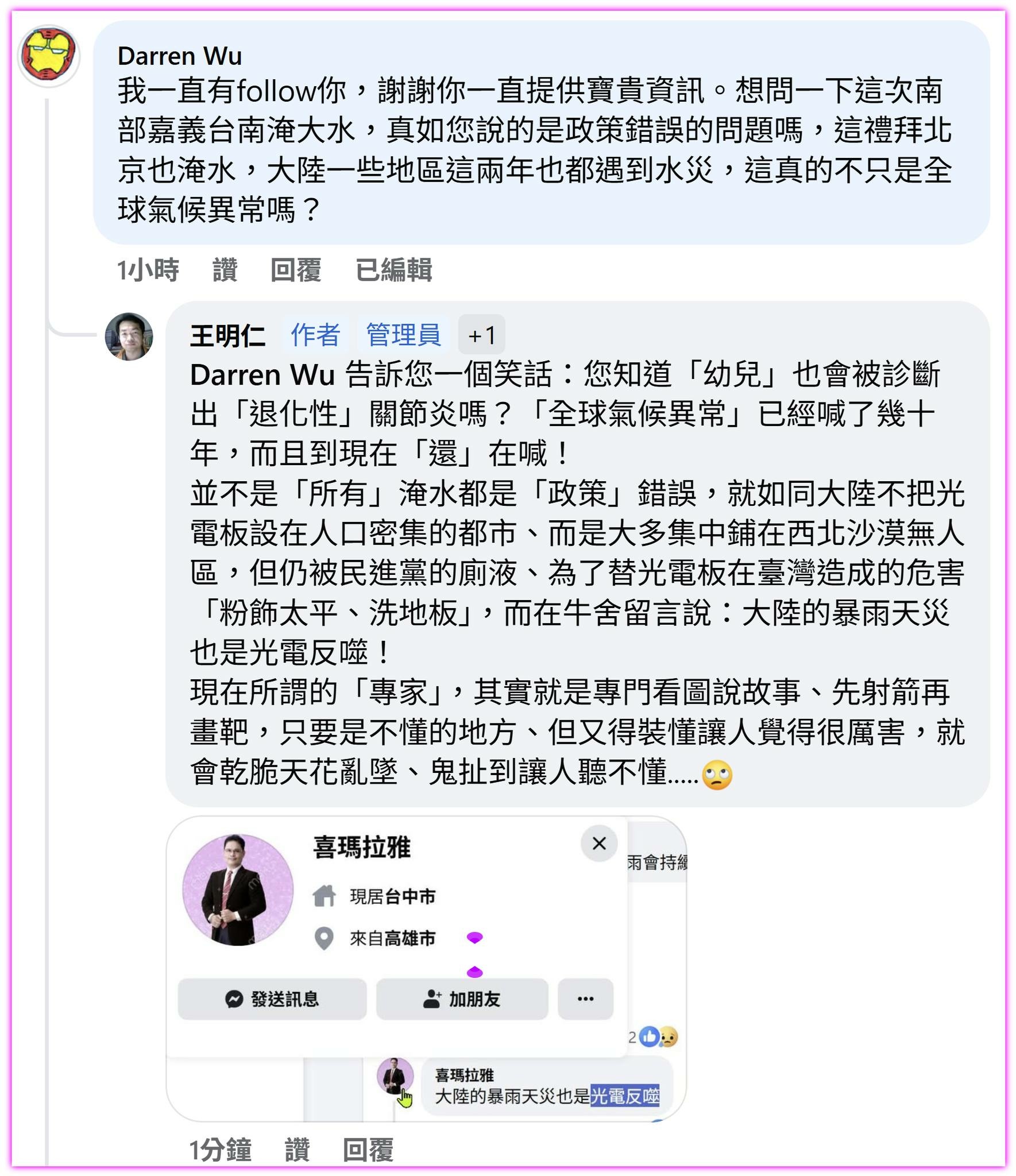 並不是「所有」淹水都是「政策」錯誤,就如同大陸不把光電板設在人口密集的都市、而是大多集中鋪在 #西北沙漠無人區,但 #民進黨的鷹爪廁液 為了替光電板在臺灣造成的危害「粉飾太平、洗地板」,而在牛舍留言造謠說:#大陸南方 的暴雨天災也是光電反噬!