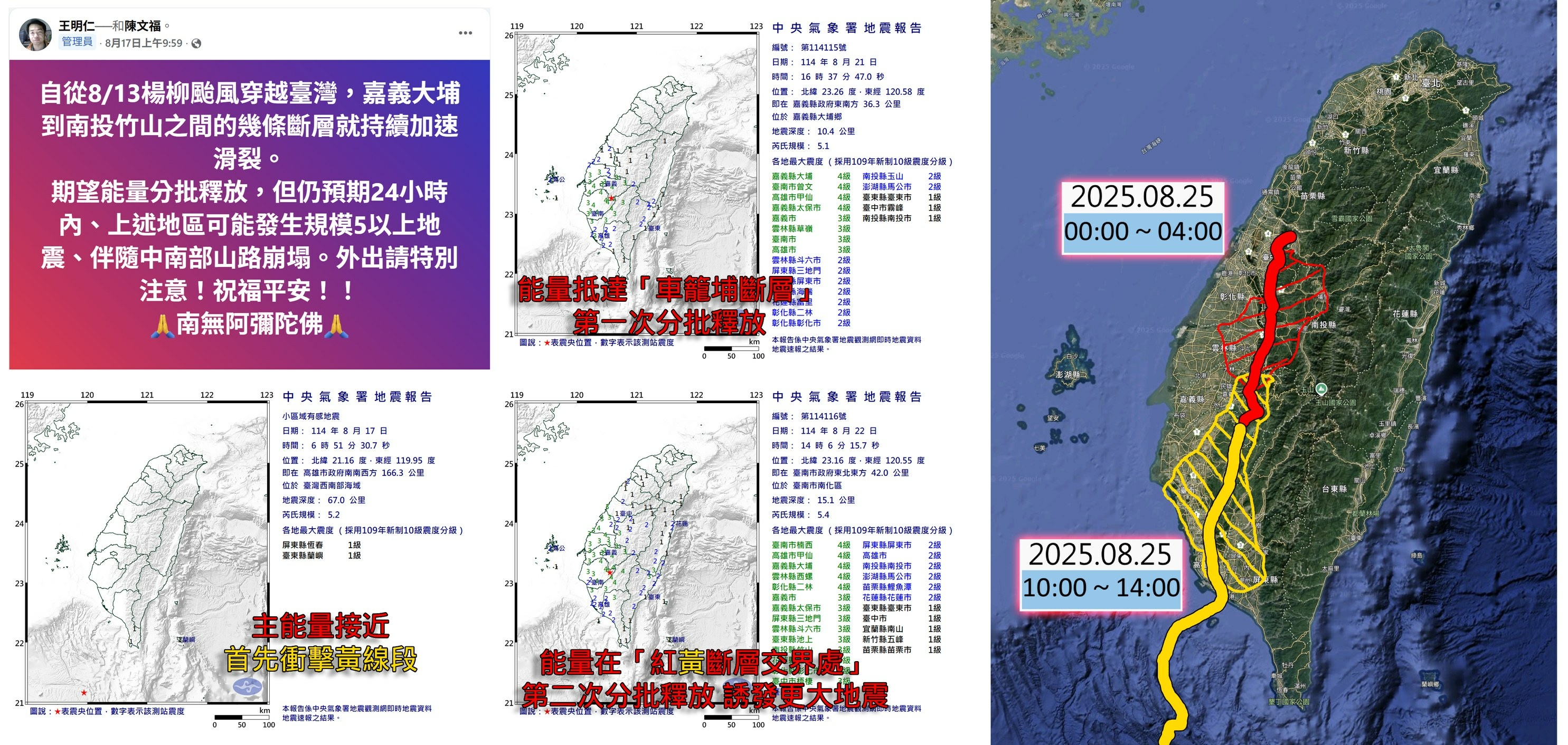 🔴先講預告:發文的此時全台都還在微地震,相信應有許多體感強烈的牛友們已有明顯感應。預期8/25 00:00~14:00,中南部可能因斷層破裂的「次序」,而發生「2波」規模5以上地震,預測詳細的地震發生時間為00:00~04:00及10:00~14:00,請參考附圖「右半部」。