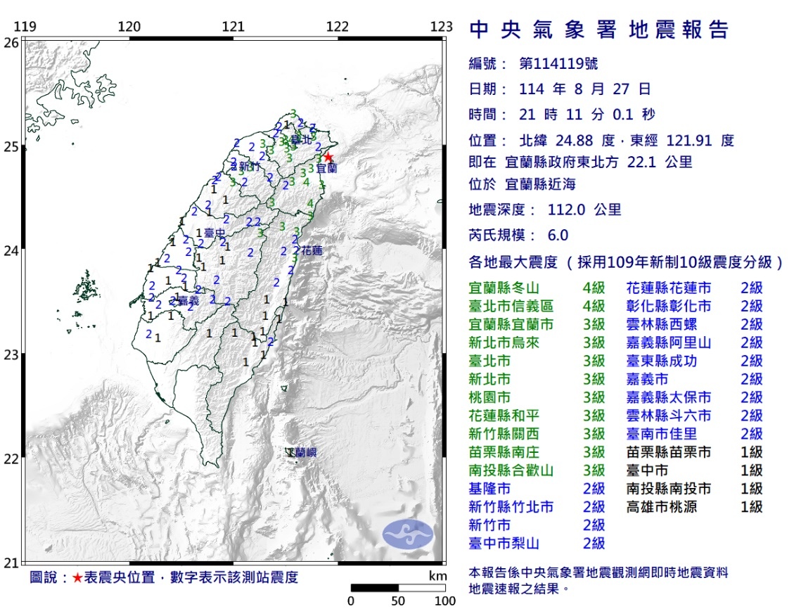 2025年8月27日 21:11 宜蘭近海發生規模6.0地震