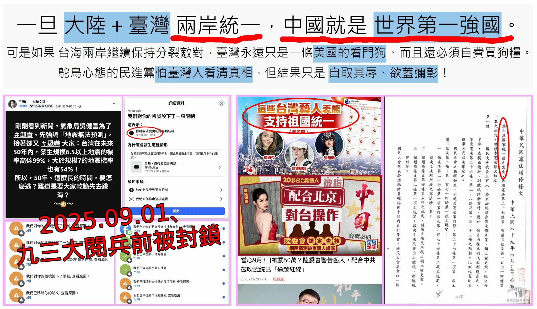 我的帳號及所成立的社團,在 中共「九三大閱兵」前夕,被黑手打壓。鴕鳥心態的民進黨怕臺灣人看清真相,但結果只是 自取其辱、欲蓋彌彰!🙄