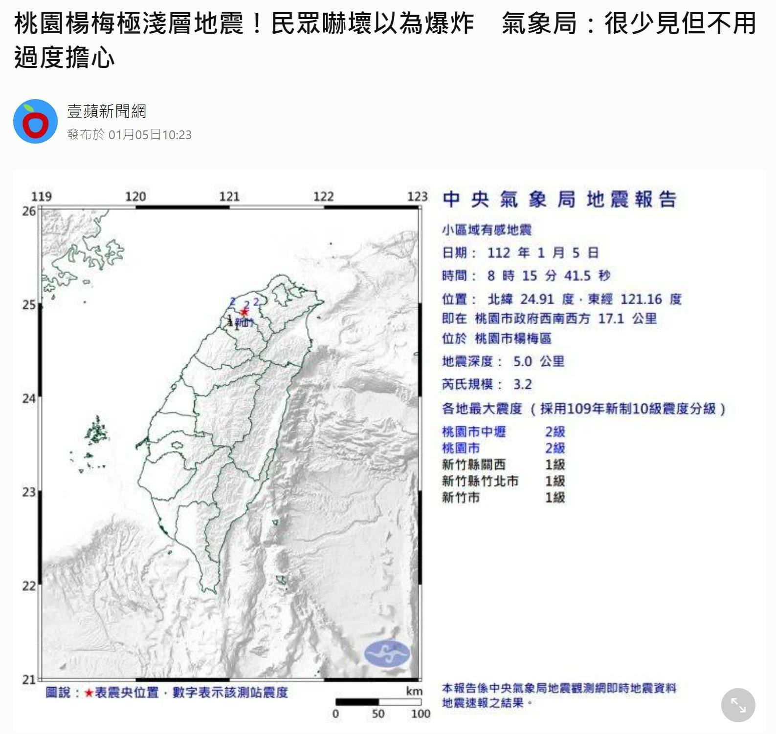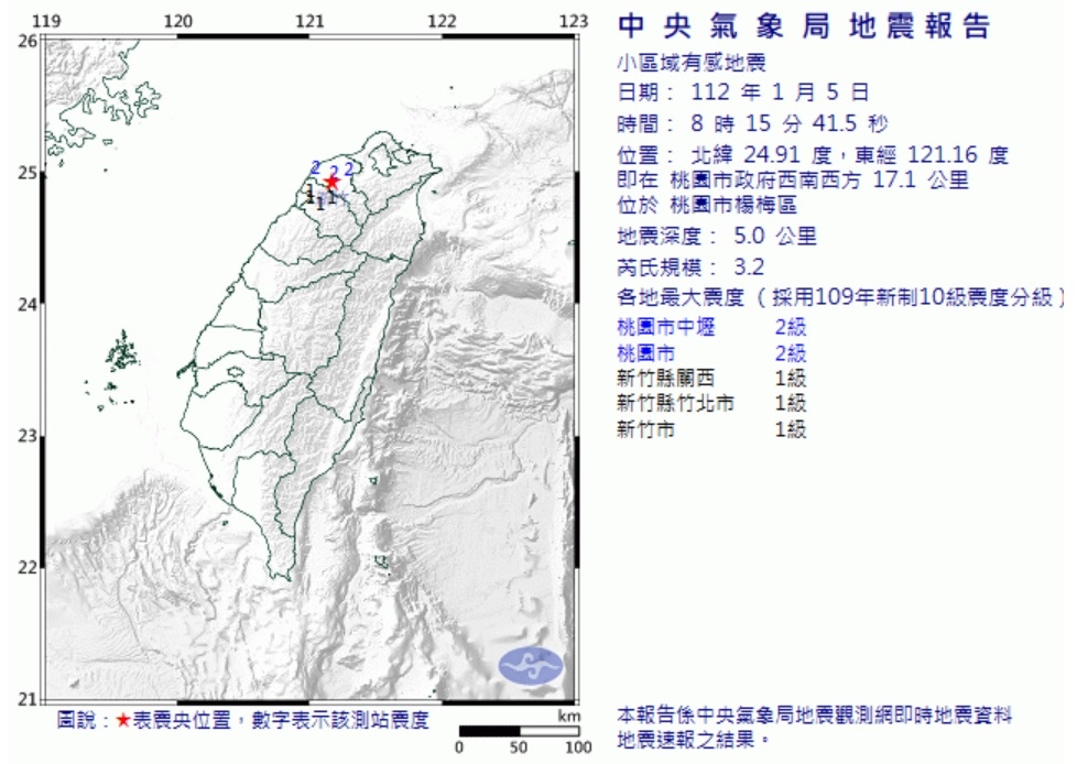 112年1月5日 08:15 桃園楊梅發生規模3.2罕見地震!氣象局:很少見但不用過度擔心