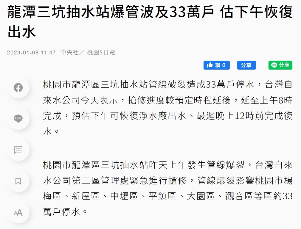 112年1月7日 桃園龍潭抽水站爆管!33萬戶受影響
