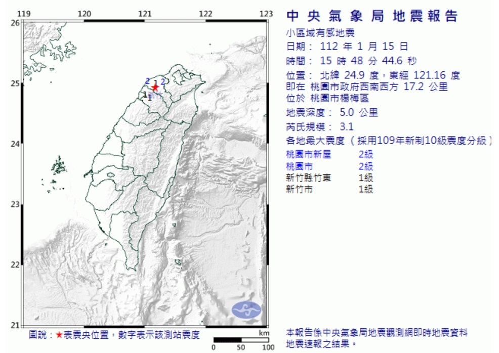 112年1月15日 15:48 桃園楊梅再度發生地震 規模3.1