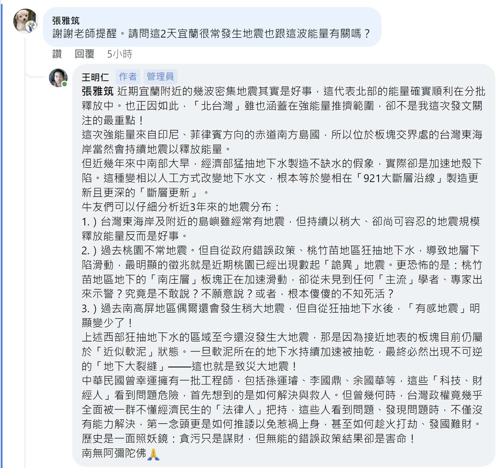 近期宜蘭附近的幾波密集地震其實是好事,這代表北部的能量確實順利在分批釋放中。也正因如此,「北台灣」雖也涵蓋在強能量推擠範圍,卻不是我這次發文關注的最重點!